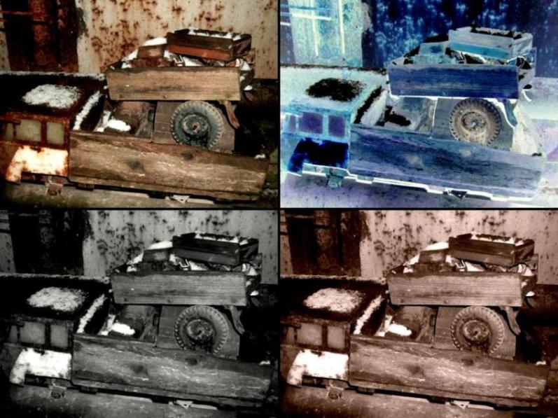 Spalvota, negatyvas, J/B, sepija.