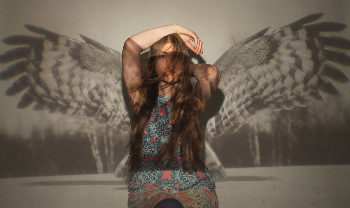 Na, galva ir yra virš sparnų :) Veidas šešėlyje todėl, nes naudojau projektorių ir projektavau visą pelėdą - tad veidas sutampa su paukščio galva, kuri ir yra tas šešėlis (ko aš ir norėjau). Gerai įsižiūrėjus, bent jau man - matos :) Kad ir kaip bebūtų - ačiū kad pakomentavai... ir, matomai, pasisakei, kad čia ne tavo musmirė :D