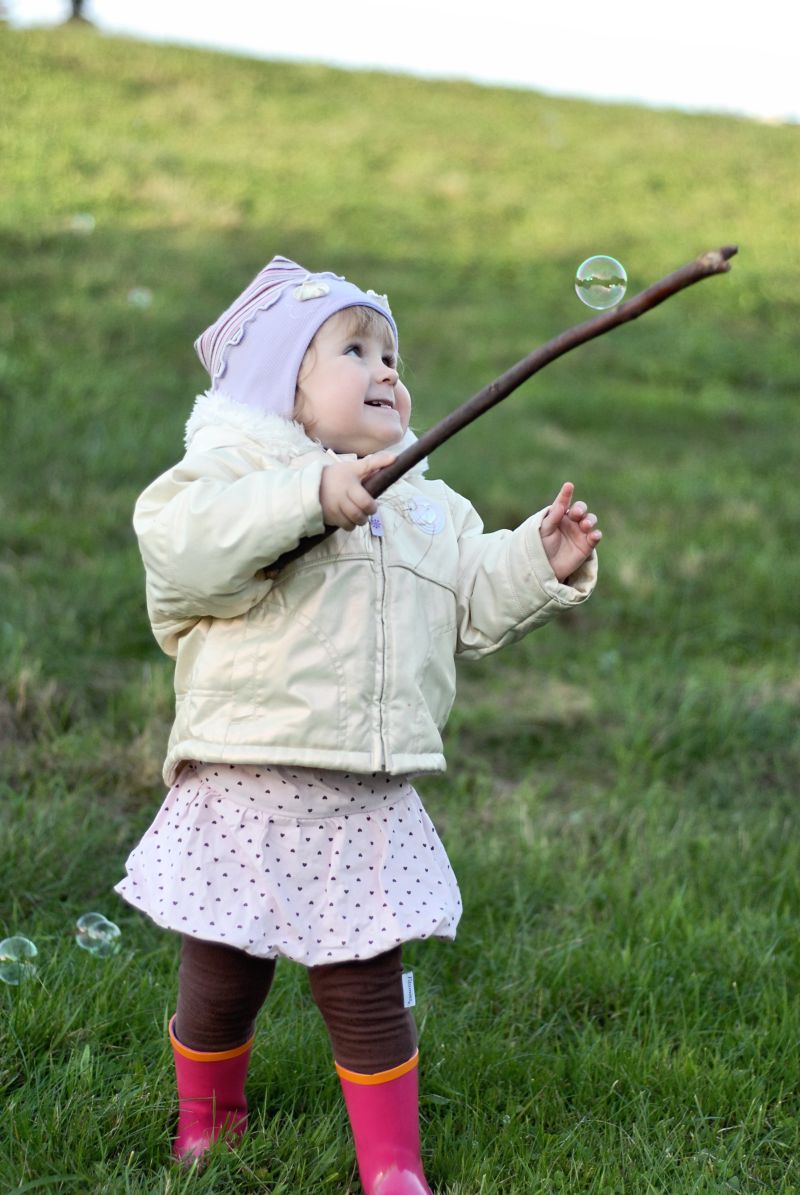 Dukrytė parke "gaudo" muilo burbulus...