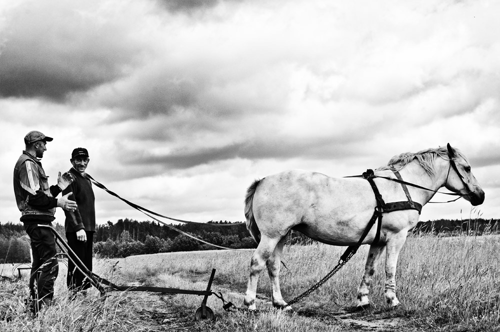 Mano galva, momentas užfiksuotas visiškai tvarkingas. Veiksmas vyksta ant kelio, nes tai tiesiog poilsio minutė. Kai arimas sudėtingas arba arėjas pachmielingas, arų savininkas turi arklį ''pavedžioti'', dėl to vadžios randasi jo dispozicijoj. Tuo tarpu arėjas vaizdžiai pasakoja, kokį nemenką karosą jis vakar pagavo (užtai ir ''laistė'') bombos išmuštoj duobėj prie miško :). Tik penki :)