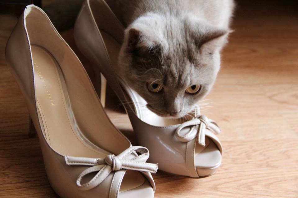 Katinėlis žiūri kažkur į tolį ir jam visai tie bateliai čia ne prie ko. Galėtumėt parodyti, į ką jis žiūri :)