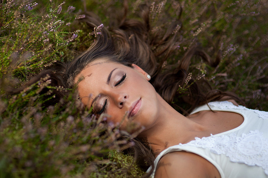plaukai pasiklydo tarp žolių