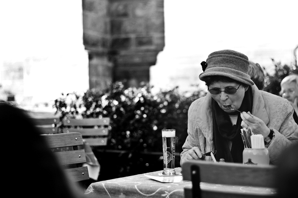 Kitą kartą bandyk pasirinkti įdomesnį siužetą negu apie kažką valgančią bobutę. O tas juodulys kadro kairės apačioje rodo, kad kompozicija nevykus, kadras nesutvarkytas iki galo. Juk laisvai buvo galima tą juodulį nukirpti. Na, bet neklysta tik tie, kas nieko nedaro. Sėkmės sekančiuose darbuose.