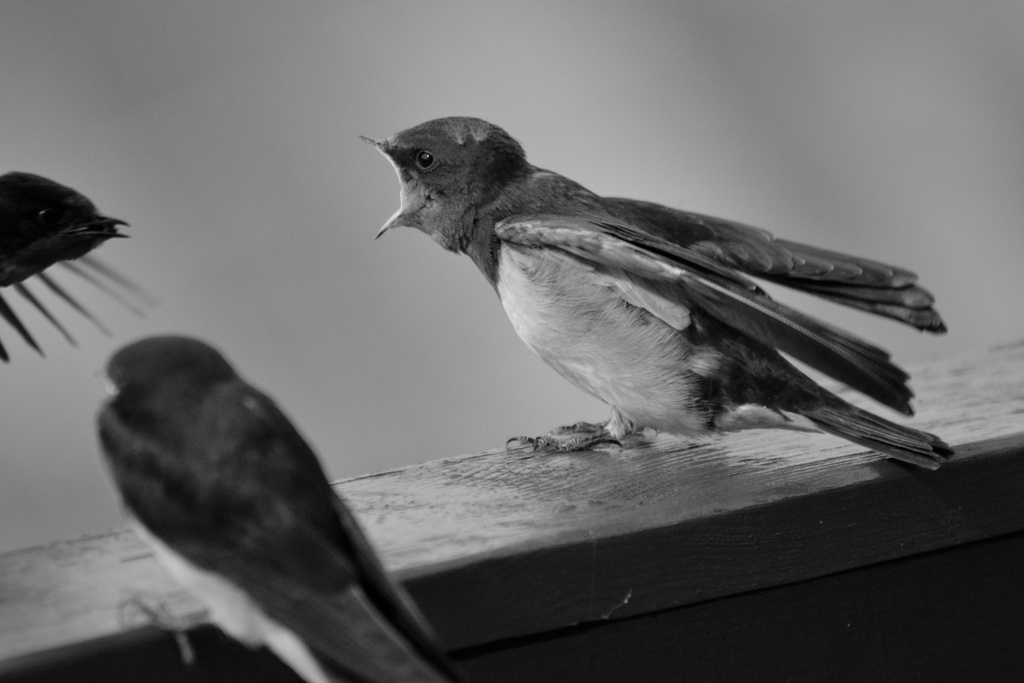 Pasisekimo valanda, visai netikėtai ant balkono nutūpė keturi kregždžių jaunikliai, bijojau kad išsitraukus "triūbą" nenuskristų, priėjau artyn ir pradėjau laukti kas vyks toliau, ir štai vienas iš keleto kadrų, vyko trumpas bet labai intensyvus jauniklių maitinimas.
