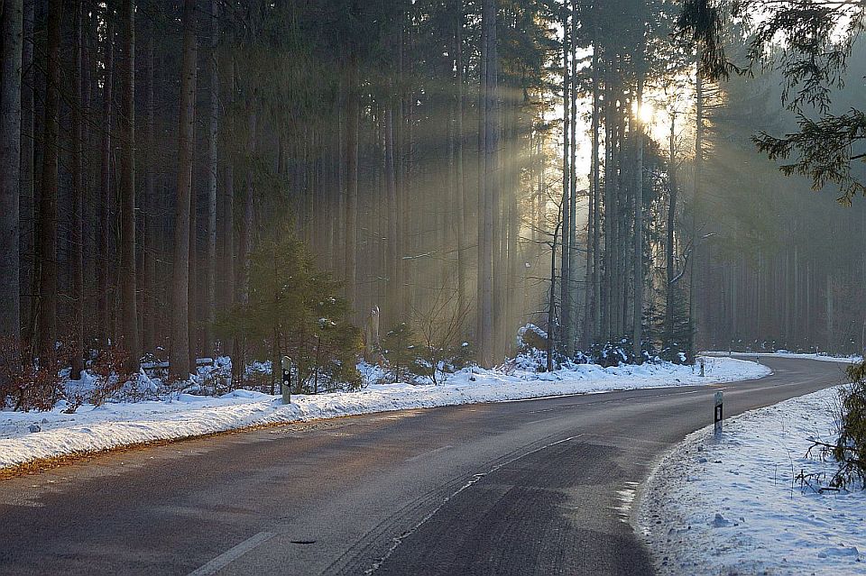 Labai gražu - ir tas kelio vingis, ir spinduliai... Tik tas nelabai išvaizdžias šakeles dešiniajame apatiniame kampe pašalinčiau...