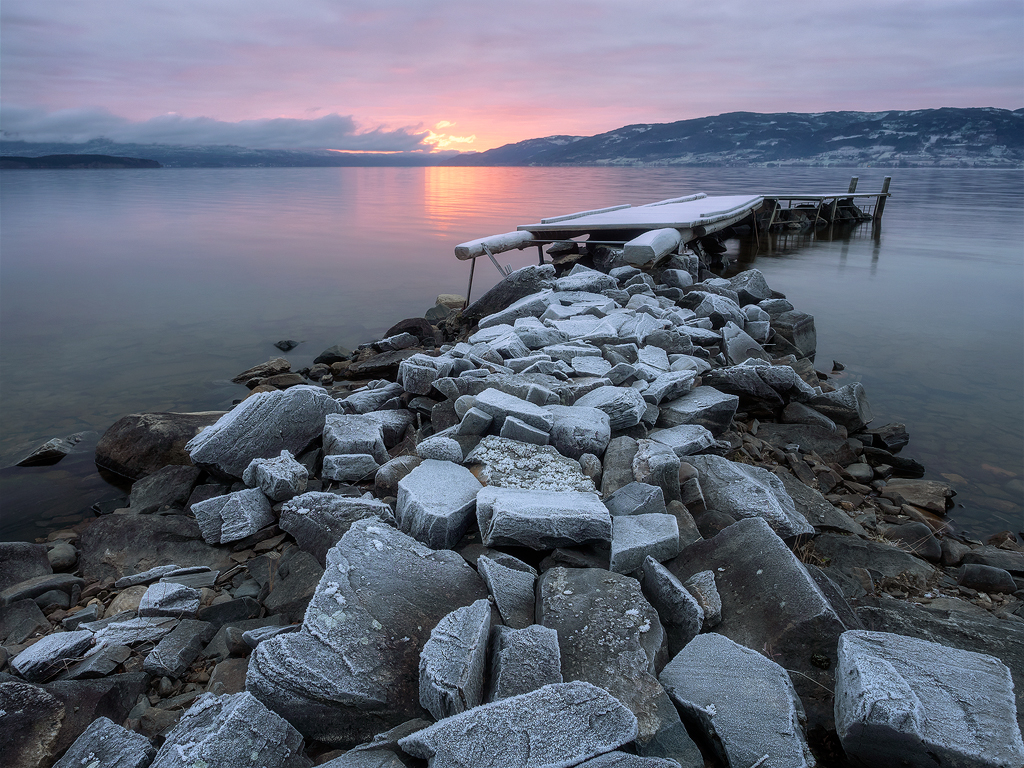 Šiandien dangus nežadėjo nieko gero, todėl patraukiau žvalgyti naujų horizontų saulėlydžių ir saulėtekių fotografavimams. Staiga, kylanti Saulė surado mažytę properšą sunkiuose debesyse ir tvykstelėjo kažkokį raudonos, oranžinės ir violetinės spalvos kokteilį į, šiaip jau, pilką ir apniukusią dieną. Priekyje mačiau prieplauką ar tiltą, todėl jau bėgdamas iš kuprinės pradėjau traukti trikojį ir fotoaparatą. Keisti objektyvų nebuvo laiko, todėl tiesiog spragsėjau tuo, kas papuolė po ranka. Bet vis tiek likau patenkintas ir šiuo kadru, ir tuo, jog dabar žinosiu bent 6 skirtingas vieteles, kur bus galima tykoti besileidžiančios arba kylančios Saulės.