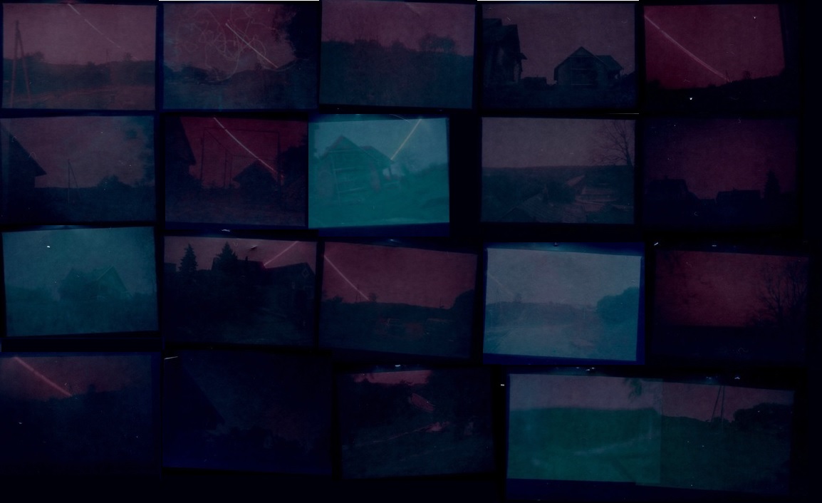 Jau daugiau nei pora mėnesių palikinėju seną tėčio fotoaparatą tai namie prie lango, tai kieme, tai pas kaimyną tvarte, prie gatvės, medyje. Tikrai nesmagu būtų jeigu jį sulytų, Arba dar blogiau, jei jo nerasčiau paliktoje vietoje. Visos nuotraukos atliktos analoginiu būdu. Keletoje nuotraukų matomas brūkšnys yra saulės judėjimas, jis mane labiausiai ir domina, tad šiai dienai aplink namus 3 kilometrų spinduliu pritaisyta apie 9 pinhole kamerų (ne bombos), kurios įamžins pusės metų nuotraukas bei saulės judėjimą. Šiame nuotraukų koliaže yra nuo vienos iki keturių dienų foto išlaikymas