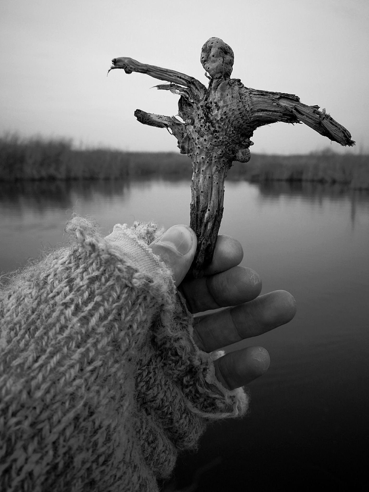 Be rankos tas pagaliukas tampa masyvia skulptūra, už kurios toliai matosi su ežeru, bet ne bala...