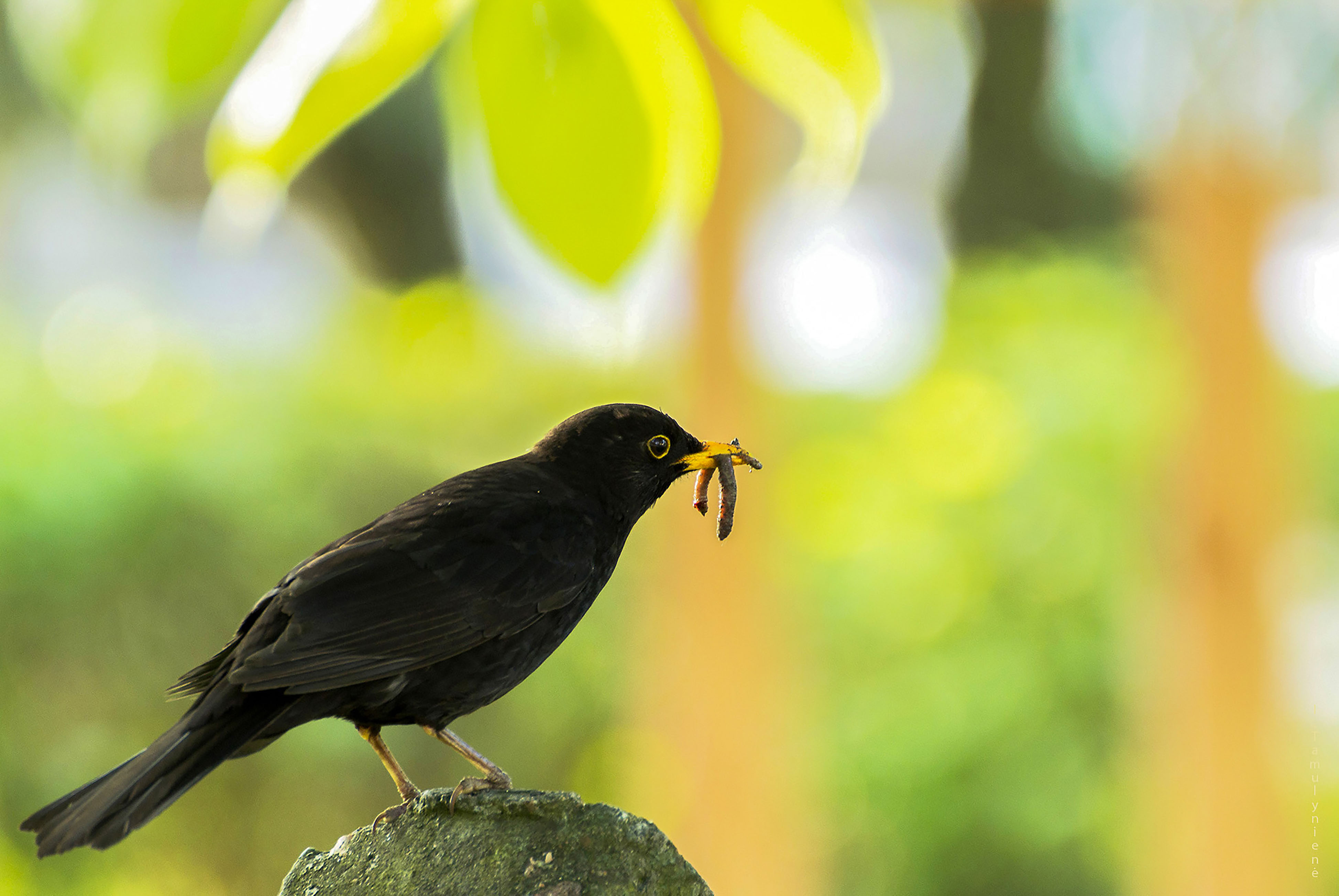 Juodasis strazdas trumpam stabtelėjo atsikvėpti ant akmens. Augina gausią šeimą, tad tik spėk suktis: mažieji tikri besočiai...
