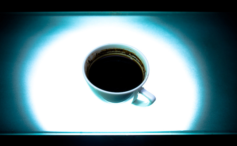 nu cia kino juostos nera :) cia tik imitacija :) turiu stala su viduryje jo esanciu matiniu stiklu, po stalu pastaciau prozektoriu, apsukau popieriumi iki pat stalo, kad gauti tokis cilindras, ir gauti apvalus ratas matiniame stikle, po to padejau kavuka puodos, blica nusukau i virshu, pridengiau baltu lapu kad nuo ji apsviestu puoduka is virshaus, vat taip ir gavos :)