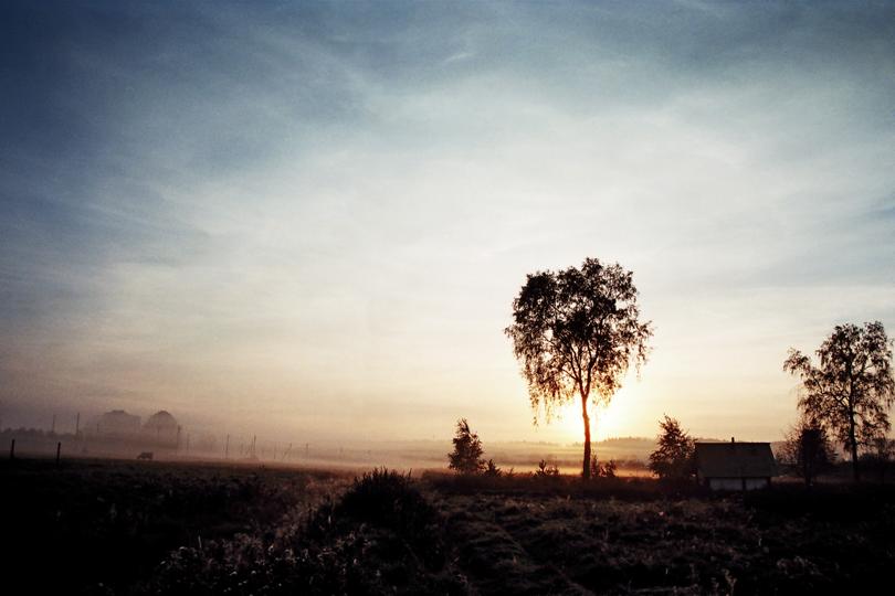 Tolumoje - labai graži rūko ir Saulės dvikova. Dangus - pasteliškai gražus, neerzina. O jau ir karvytė laukan išginta.