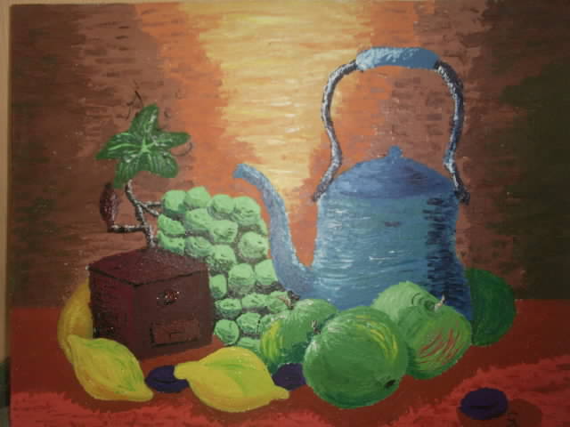 obuoliu ir arbatnio virpejimas vangogiskas. idomiai issprestas fonas. rudoji dezute ne perspektyvoje ir griuna i sona - bet man netrukdo. noreciau originala pamatyt. :)