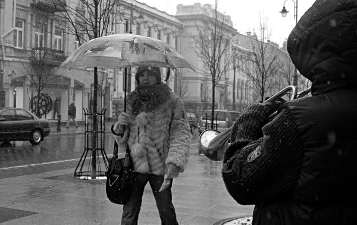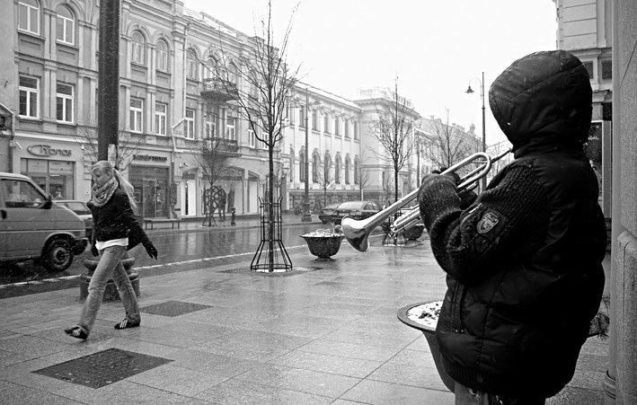 pamaciau ji Gedimino pr. slykstus sniegas lipde akis, pute ledinis vejas, zmoniu (nors buvo dienos vidurys) centrineje miesto gatveje beveik nebuvo. nesimate net benamiu, kurie paprastai cia valkiojasi. o jis stovejo ir grojo. prisipazino, kad jau susalo, bet sake dar "padirbesias". prisipazino, kad jam 14, sake trimitu grojas muzikos mokykloje. grojo jis visai graziai, net pagavau save galvojant, kad iki siol nezinojau, jog trimitu galima isspausti tokias melodijas. tuo metu pro sali skubejo vienisi preiviai, tik vienas kitas vos pasukdavo galva i ta puse, is kurios sklido liudna melodija. ta ketvirtadieni uzsidirbti jam nepavyko