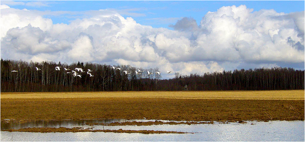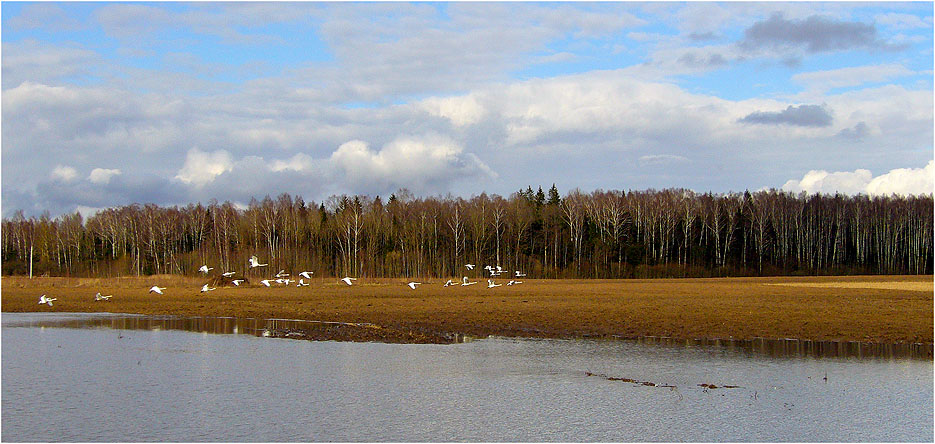 Grįžtant namo iš Anykščių baloje vydury lauko mačiau gal kokias keturiastdešimt gulbių.Man sustojus šalykelėje jos išsigande pakylo į dangų.Pradžioje vienas būrys,po to kitas.Sau ir pagalvojau...gal pavasaris atėjo....:) Nors dabar ir oras gana bjaurus,gal nors kiek šie pavasariniai vaizdai pakels jūsų nuotaiką......Su Šv.Velykom...